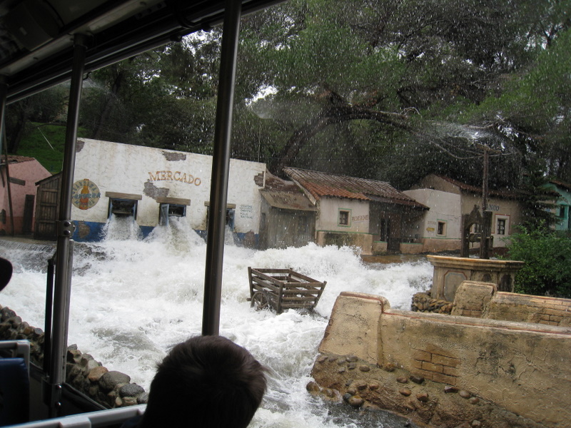 After breakfast, we went to Universal Studios. There was a light sprinkling of rain that turned into a major downpour and flooding. Here we are on the shuttle tour inside the park.