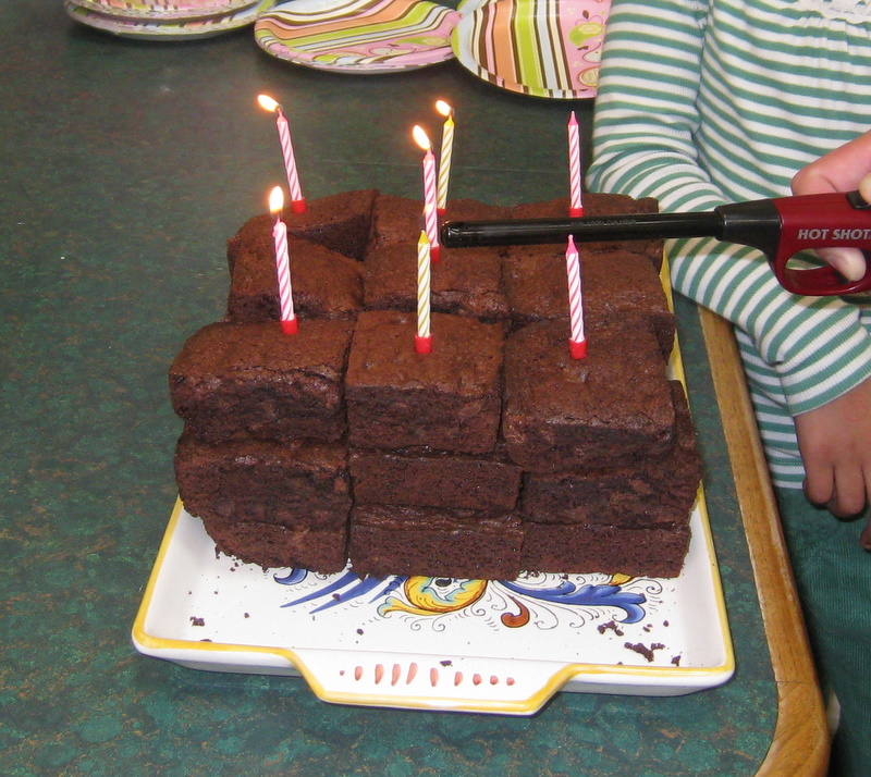 Here is her “homemade chocolate chip brownie cake” since she doesn’t like regular cake with frosting.