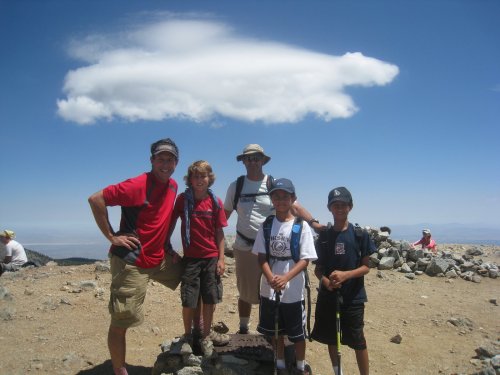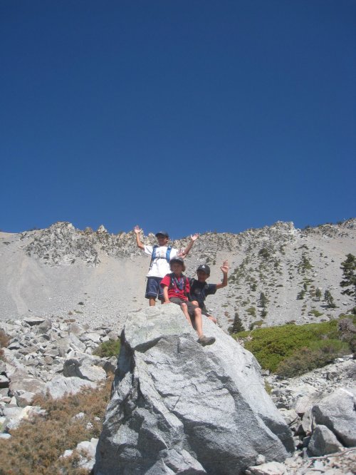 The boys and I are going to Yosemite in a couple of weeks. To prepare, we went on a hike last weekend up to the top of Mt. Baldy. Doug E and his son Adam joined us as our official tour guide. Mt. Baldy is one of the tallest peaks in So Cal at about 10,100 feet. We started at about 6200 feet and climbed up and back down in about 7 hours.