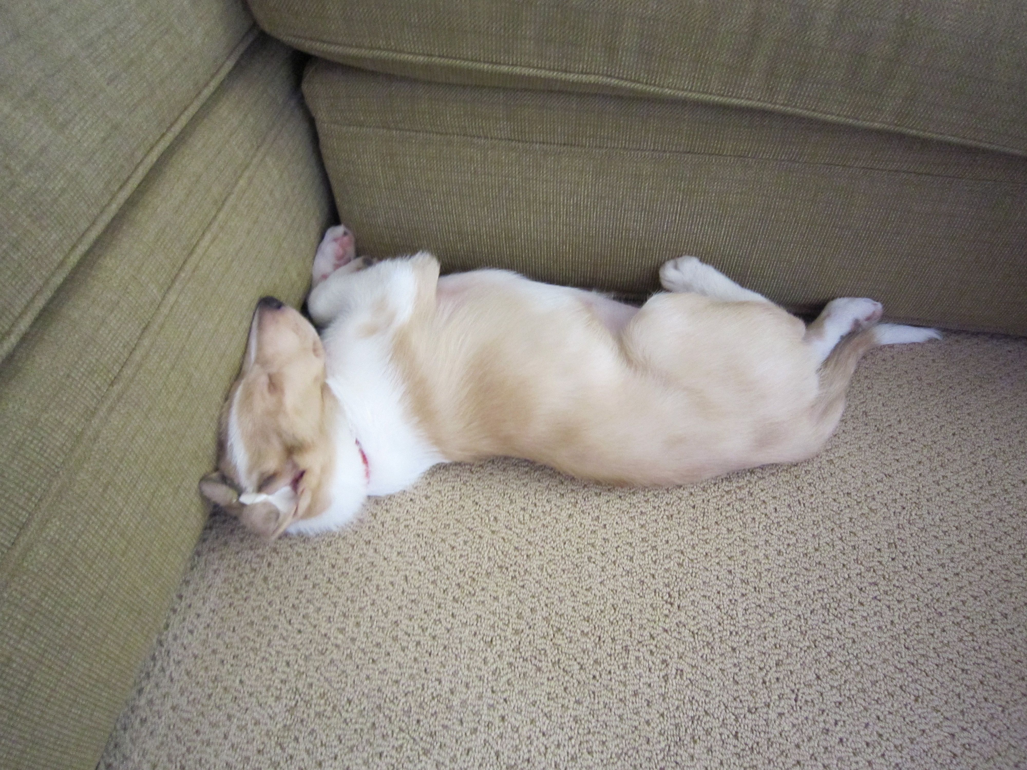 We are crate training Joey, but in the meantime, he has picked out a cozy spot by the sofa.