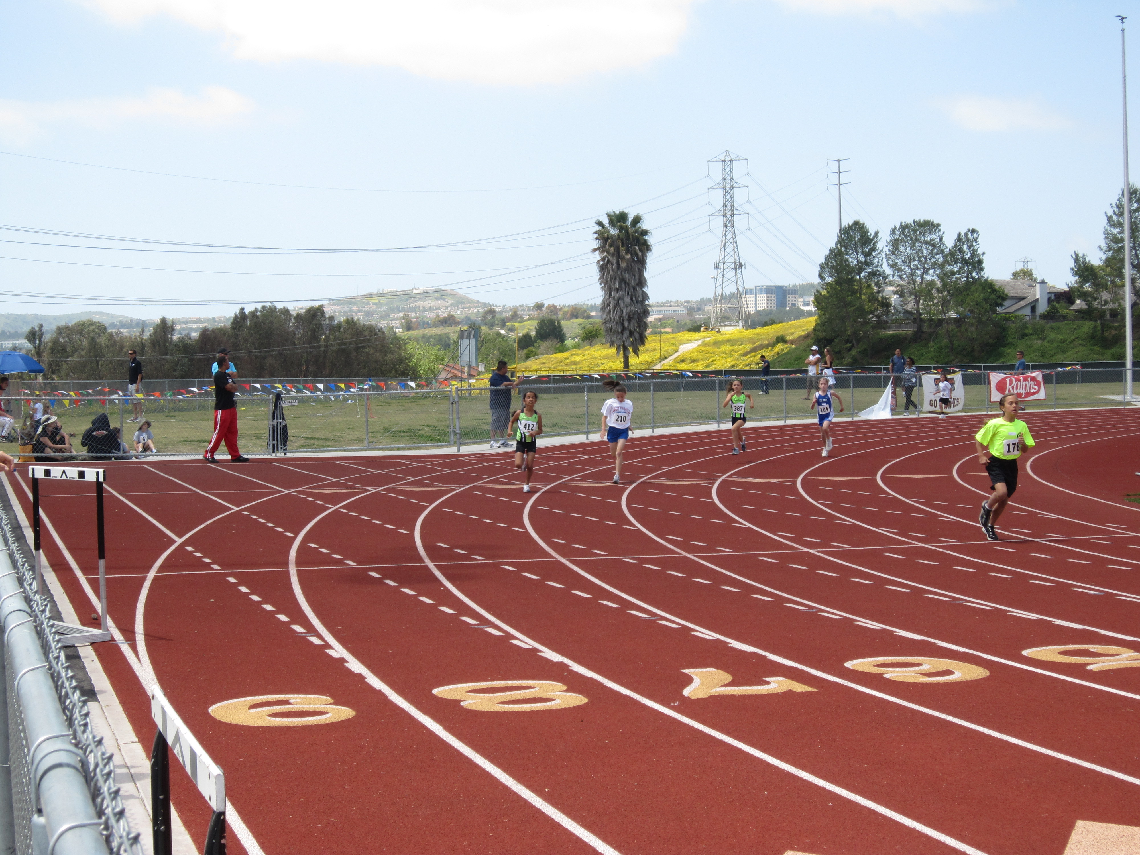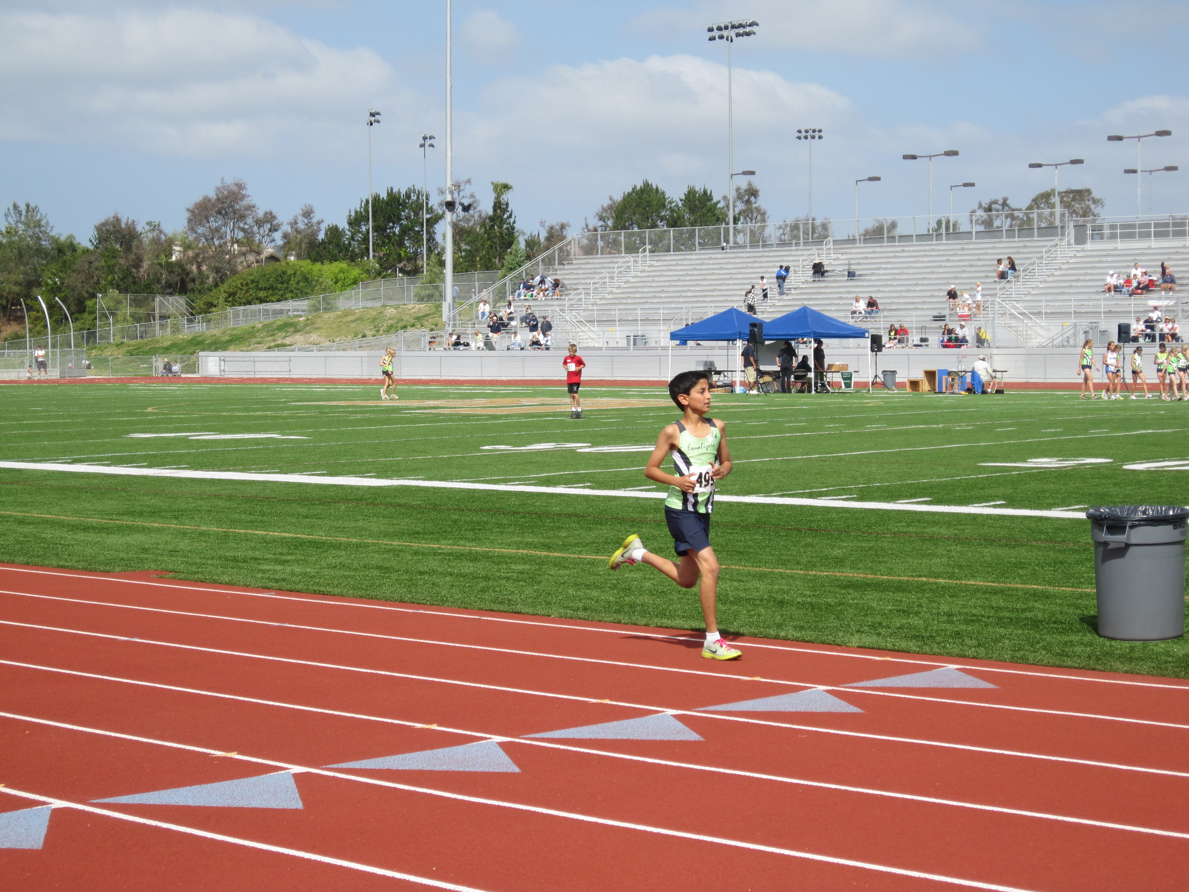 After his run, Annika ran in the 400M and 200M and got 2nd and 4th place. She improved her 400M time to 82 seconds which was a 5 second improvement from a couple of weeks ago. Here she is on the outside lane on the way to the finish.