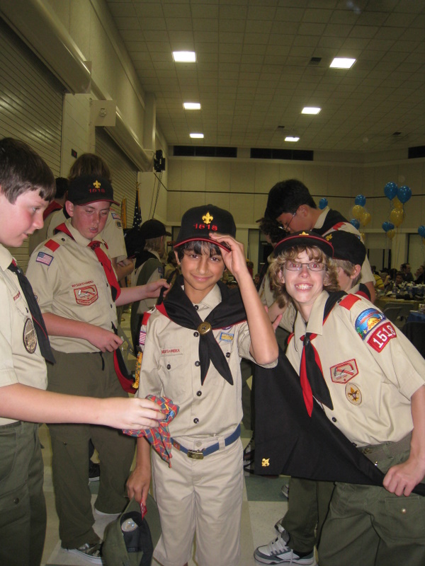 Here is Vikram “crossing over” and his new troop members welcoming him to the troop. Note the new hat and bandana!